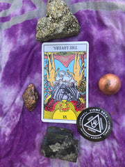 On a high throne looking into a clouded sky sits the queen with a raised sword (highest ideals) in her left hand. " let those approach who dare" is the vibe of this image. The throne decorated with butterflies of the soul and under the arm we see a sylph. This pull is in the 4th house and is the quick witted keen widow. One is unable to bear children or practice.Do not take the elder for granted, look into their eyes and see yourself. See that our ancestors paved the way for all of us to be here, is what you see and become worthy? Be the legacy!